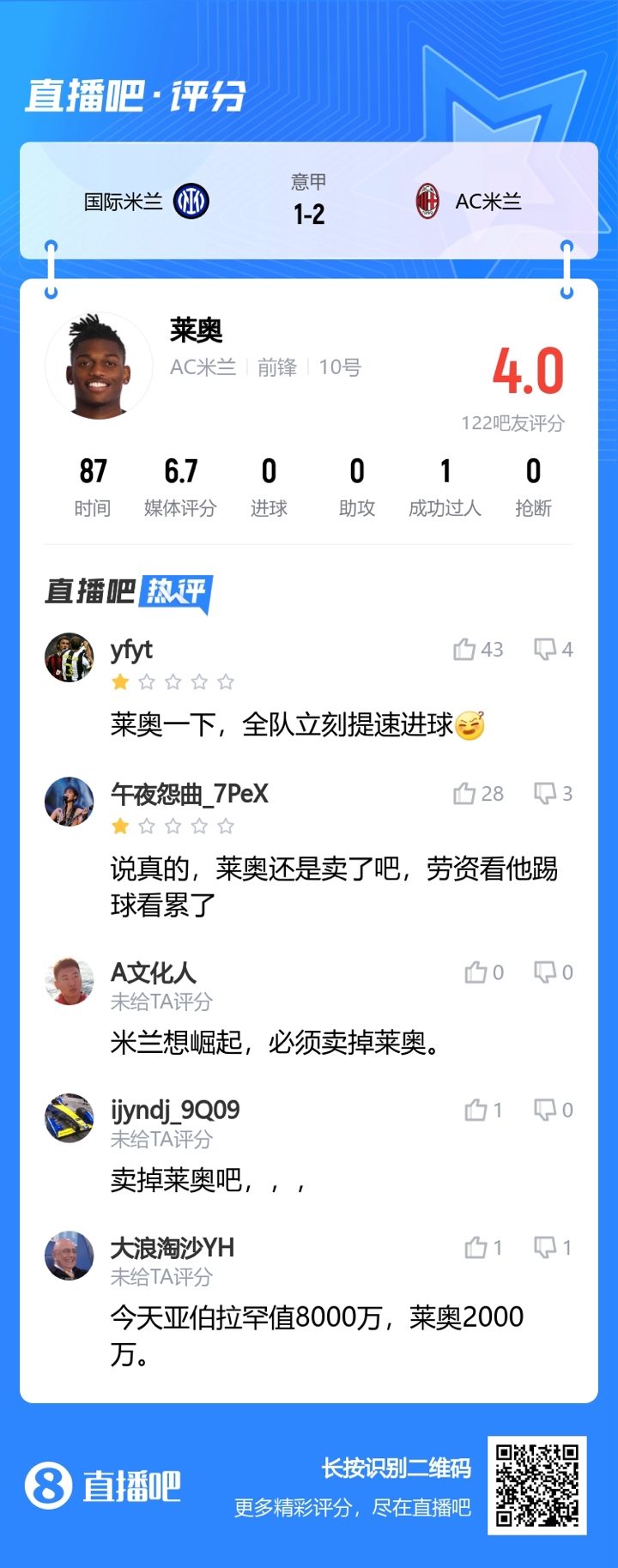 意甲联赛第5轮,AC米兰客场2-1战胜国际米兰,不过本场莱奥的表现让球迷们很不满意。