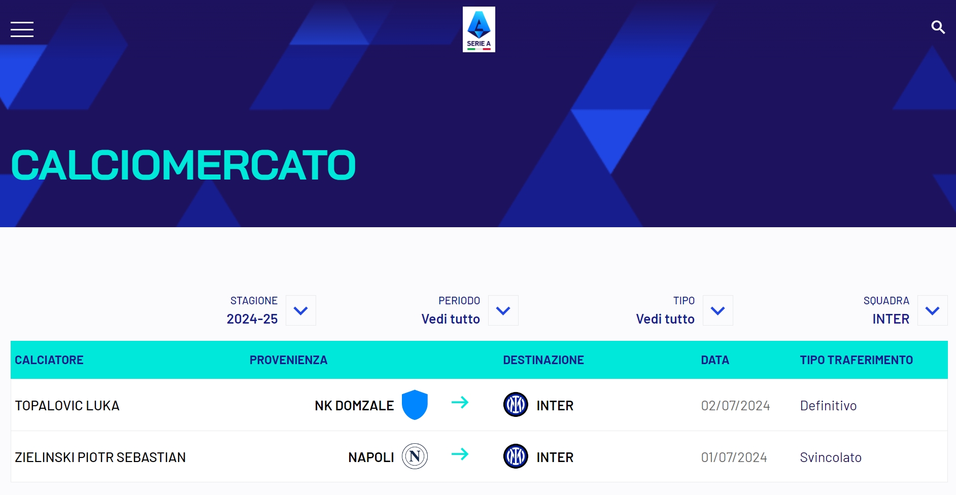 意甲官网更新,那不勒斯中场泽林斯基加盟国际米兰。