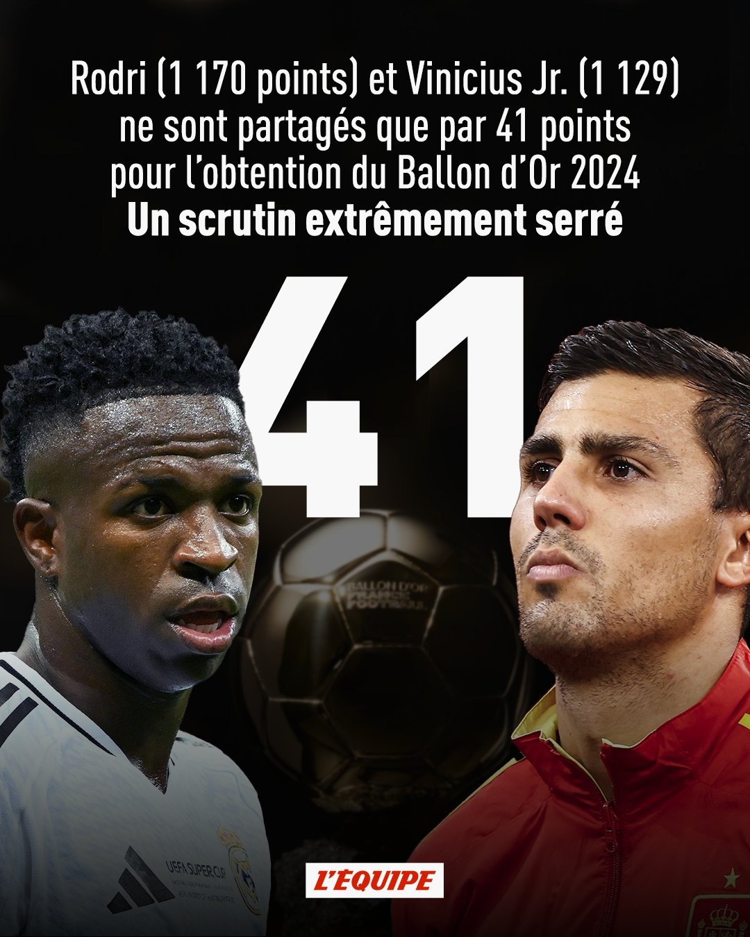 有49名记者将第一票投给了罗德里,有33名记者将第一盘投给了维尼修斯。