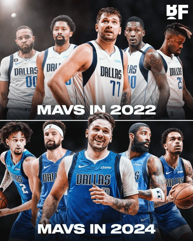 今日,NBA知名美媒@Basketball Forever更新社媒,晒出独行侠2022年和2024年揭幕战首发阵容对比。