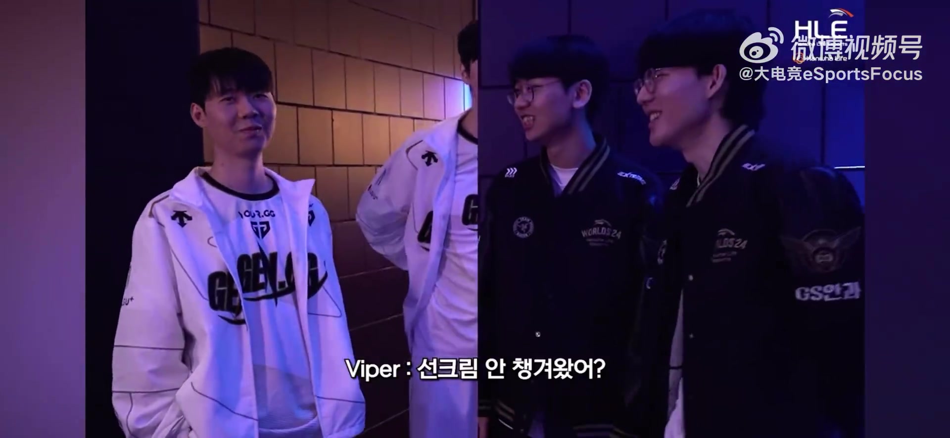 10月13日讯 2024英雄联盟全球总决赛正在进行,Viper、Doran和Chovy、Lehends在后台碰面合照。众人的对话如下: