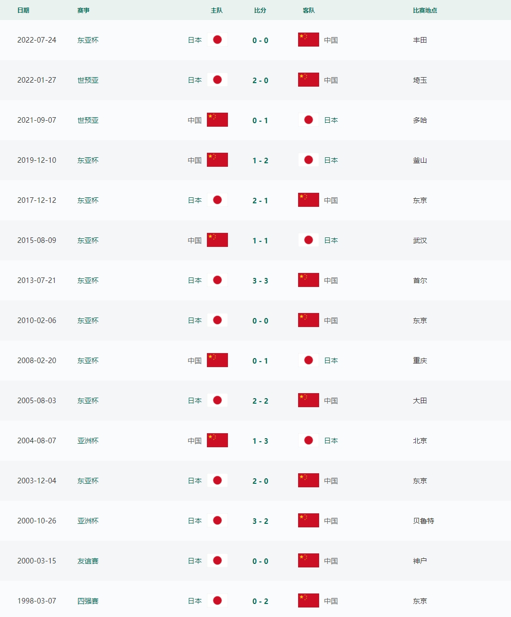 据统计,中国男足上一次击败日本是在1998年的戴拿斯杯四强赛中,当时国足2-0击败日本。此后国足各项赛事至今已14场不胜日本,期间总战绩为14战8负6平。