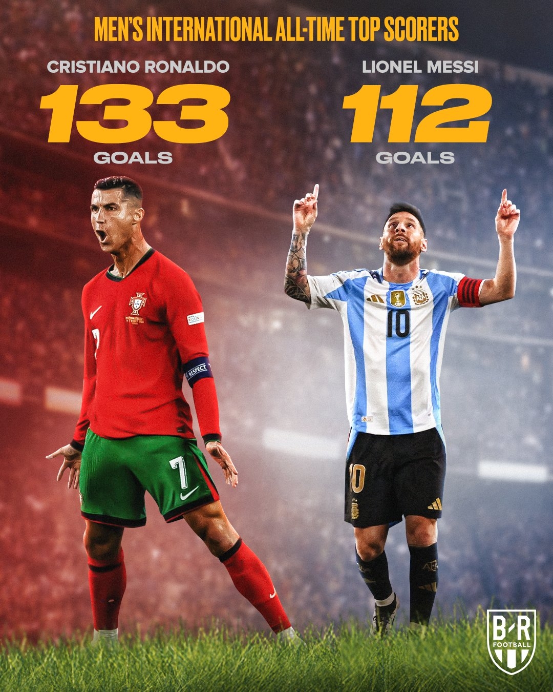 C罗目前在国家队打进133球,梅西打进112球。BR晒图:“C罗与梅西仍在争夺纪录。🐐🐐”